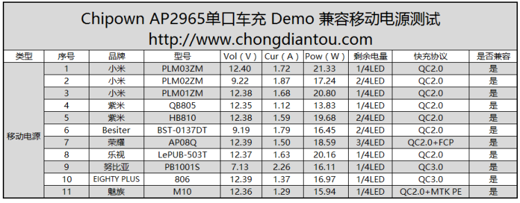 首諾信基于Chipown AP2965單口QC3.0車(chē)載充電器對(duì)幾款常見(jiàn)的移動(dòng)電源有著很好的兼容性和強(qiáng)大的輸出功率。小米PLM03ZM、小米PLM01ZM、樂(lè)視LePUB-503T充電功率均突破20W,對(duì)其余設(shè)備的輸出功率基本在15W以上。